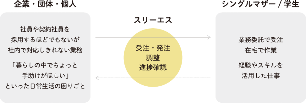 そこで、私たちはシングルマザーと学生に自由な時間に仕事をしてもらうことで支援する組織を立ち上げました。